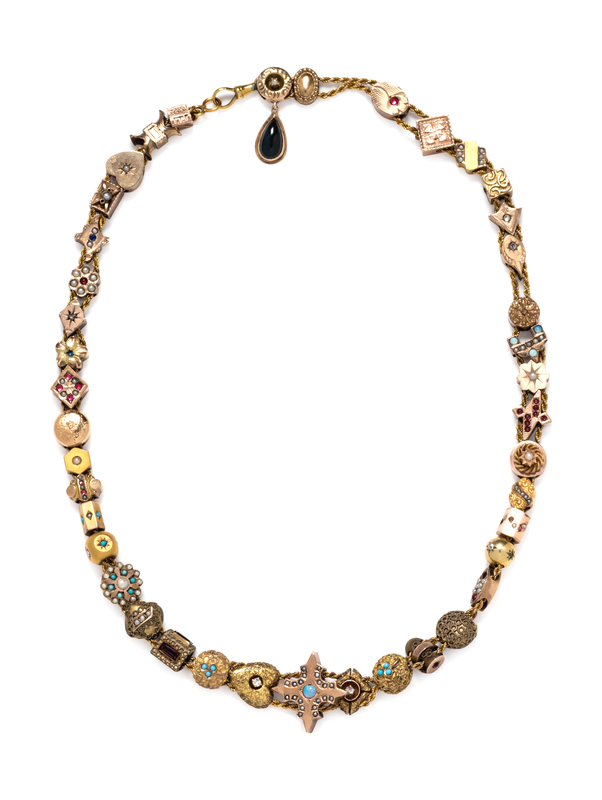 A Gold, Mixed Metal, Gemstone, and Synthetic Gemstone Charm Necklace,