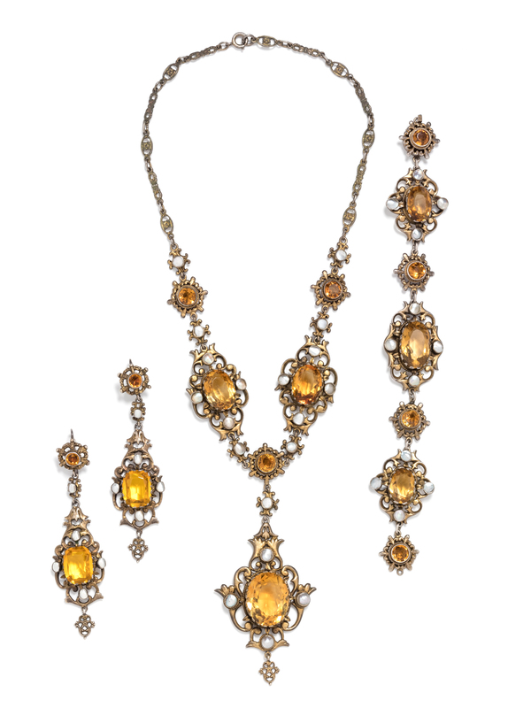 An Antique Gilt Silver, Citrine and Cultured Pearl Demi-Parure,