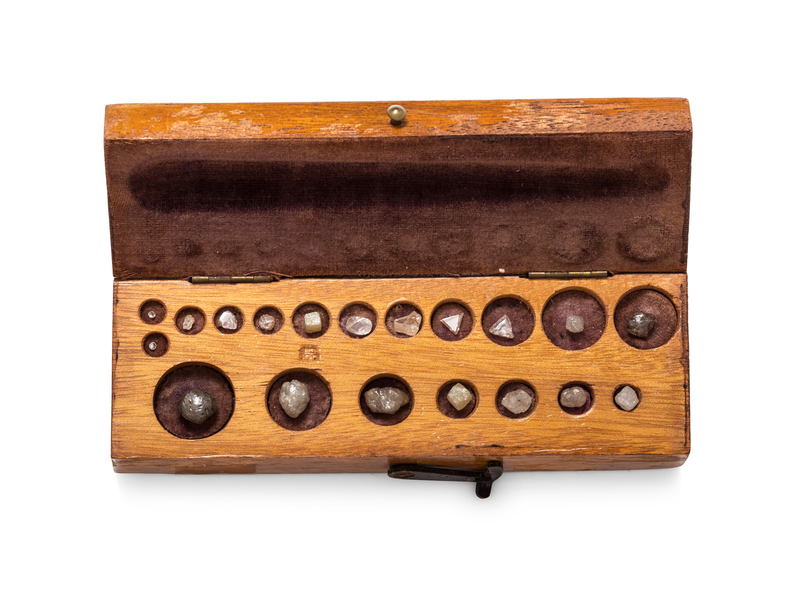 consisting of a fitted wooden box containing one single cut diamond and 18 rough diamonds of various shape and size.