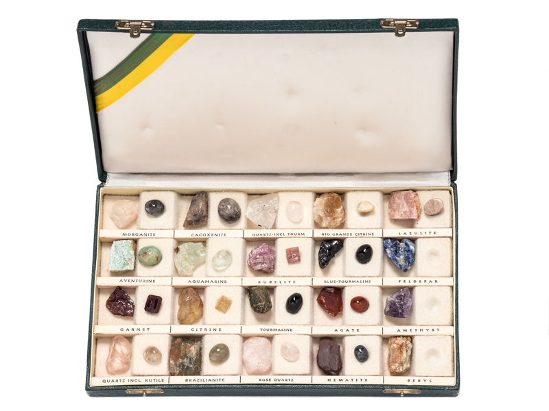 consisting of a fitted case containing 20 specimens of rough and polished gemstones.
