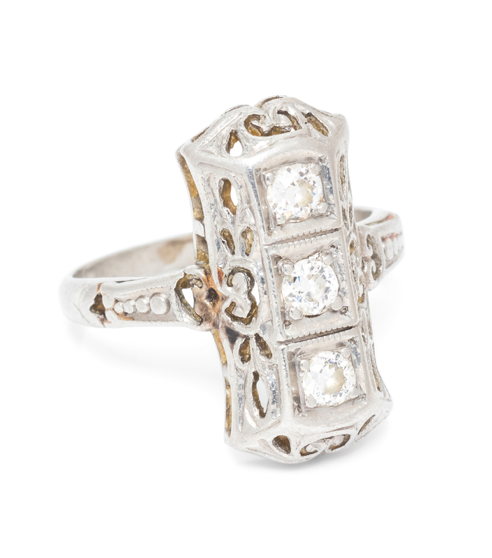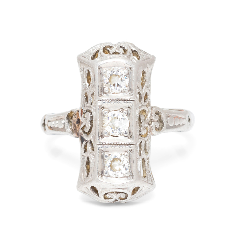 containing three transitional cut diamonds weighing approximately 0.12 carats total.