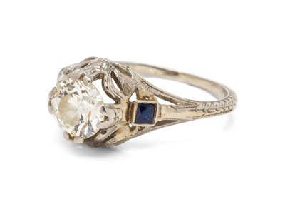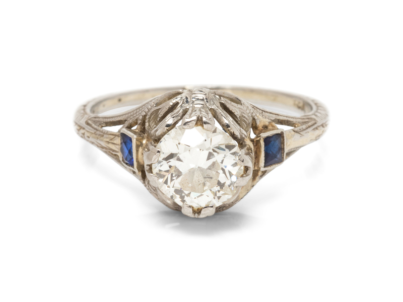 containing one old European cut diamond weighing approximately 0.90 carat and two square French cut synthetic sapphires, with openwork and engraved detail.