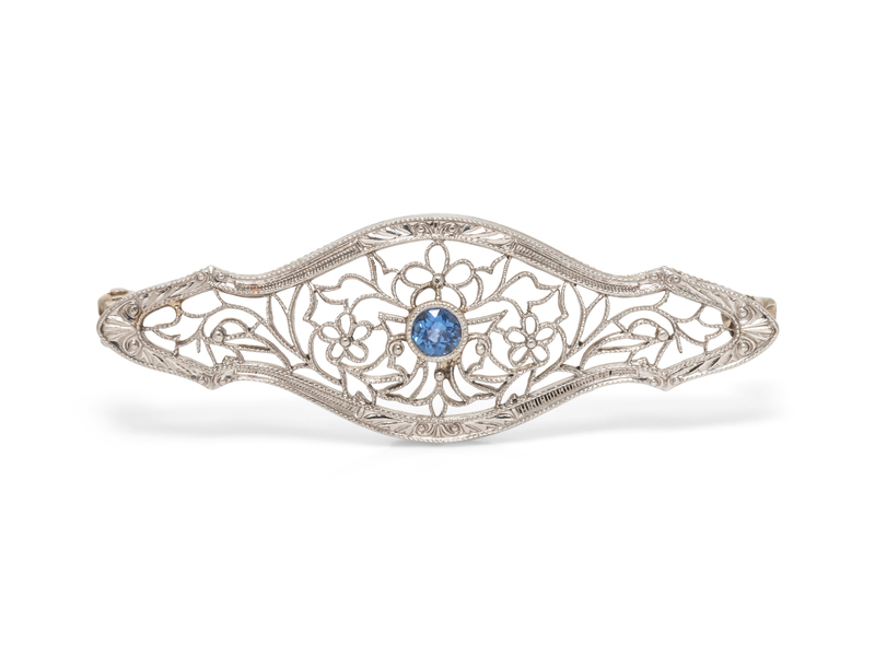 containing one round mixed cut sapphire measuring approximately 2.50 mm in diameter with filigree and engraved detail.