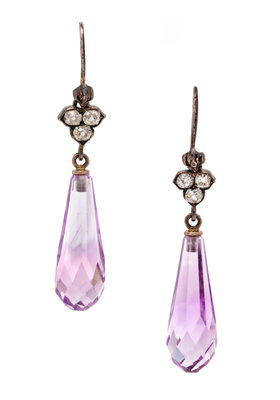 consisting of two amethyst briolette drops measuring approximately 22.00 x 7.65 mm and eight old mine cut diamonds.