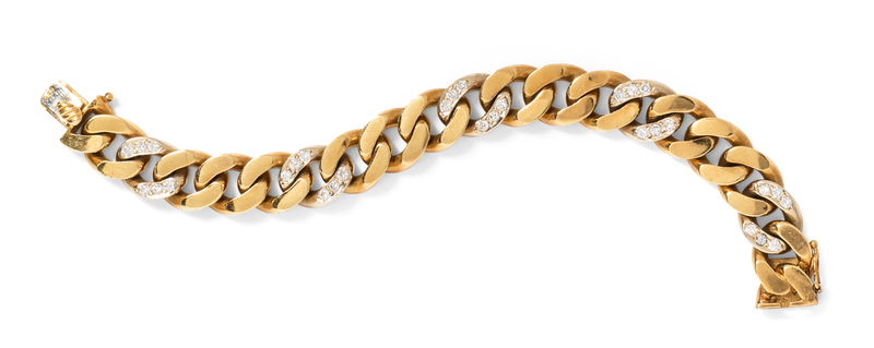 consisting of a yellow gold curb link chain with five white gold links containing 30 round brilliant cut diamonds weighing approximately 1.20 carats total.
