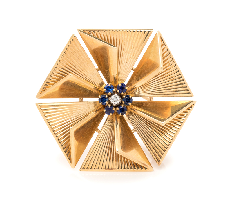 A 14 Karat Yellow Gold, Sapphire and Diamond Brooch,