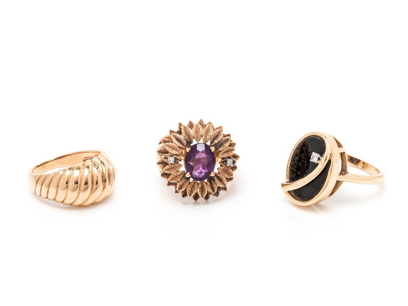 consisting of a ribbed bombe ring, a floral motif ring containing one oval shape mixed cut amethyst measuring approximately 9.30 x 7.20 x 4.45 mm and two single cut diamonds, together with a ring containing one oval shape onyx plaque and one round brilliant cut diamond.