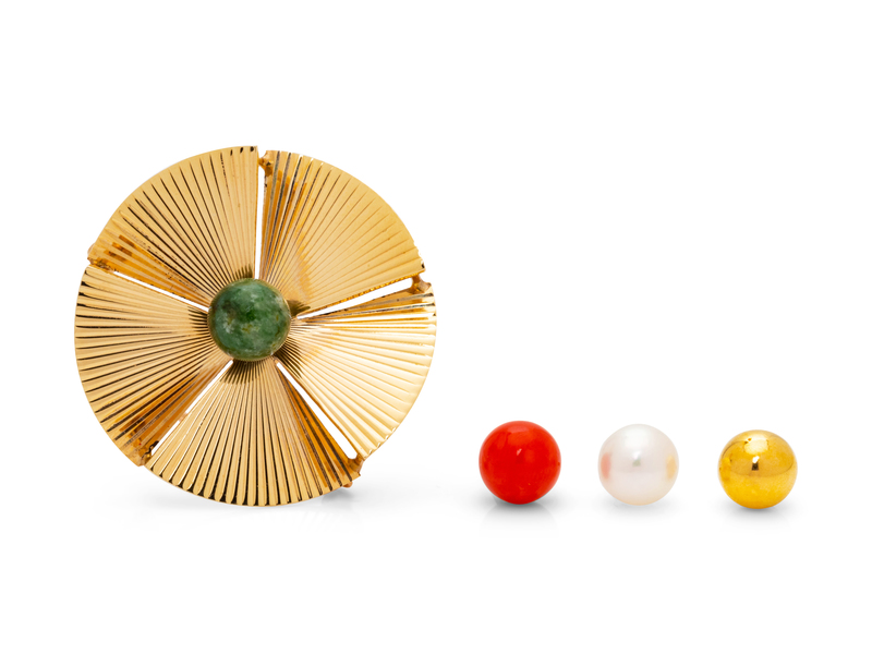 consisting of a stylized ribbed brooch with interchangeable cultured pearl, yellow gold, coral and nephrite sphere centers.