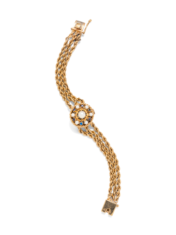 A 14 Karat Yellow Gold, Sapphire, Synthetic Sapphire and Cultured Pearl Wristwatch,
