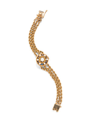 the hinged cover containing six pearls and six synthetic and natural sapphires, matte silvered dial, applied gold dot and triangle numerals, gold lozenge hands, snap on case back, 17 jewel movement signed VILLEREUSE WATCH Co, triple rope chain bracelet, box clasp with safety chain.