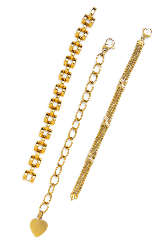 consisting of an oval link bracelet suspending a heart charm, Italian, a bracelet with half moon shape links, together with a triple chain bracelet surmounted with three 'X' motifs.