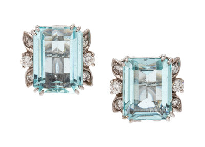 A Pair of 18 Karat White Gold Aquamarine and Diamond Earclips, Italian,