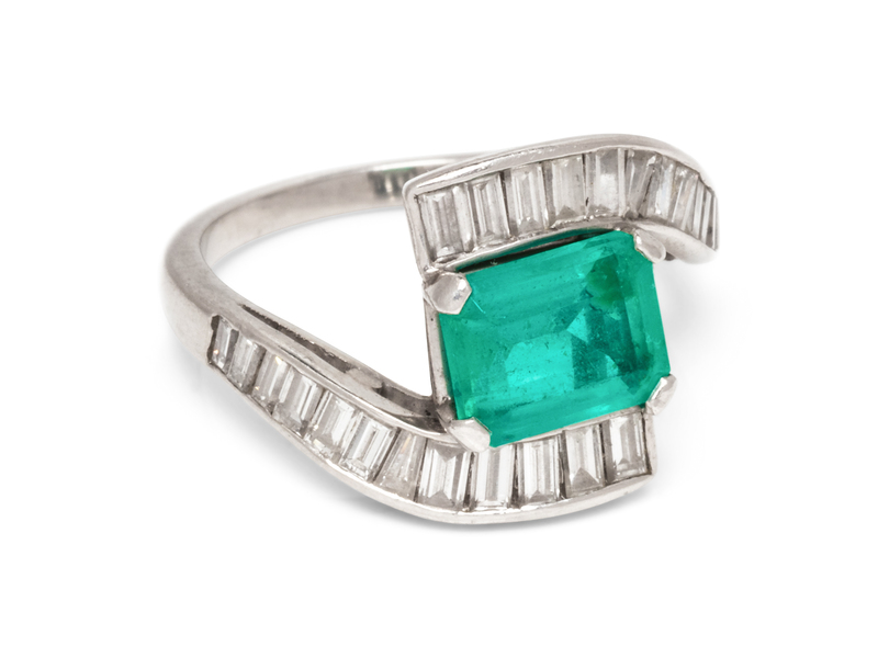 containing one octagonal step cut emerald measuring approximately 7.65 x 6.05 x 3.65 mm and 24 baguette cut diamonds weighing approximately 0.50 carat total.