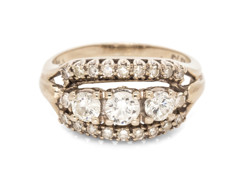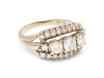 containing three round brilliant cut diamonds weighing approximately 0.58 carat total and 20 single cut diamonds weighing approximately 0.20 carat total.