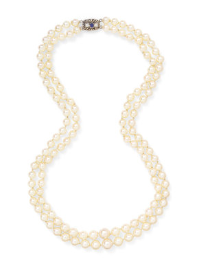 consisting of a four strand Baroque pearl necklace with silver clasp, a double strand necklace strung knotted with a white gold clasp containing one oval shape mixed cut sapphire and two round brilliant cut diamonds weighing approximately 0.08 carat total, together with a double strand necklace strung knotted with a 14 karat yellow gold clasp containing one single cut diamond and five round mixed cut sapphires (with extra pearls).