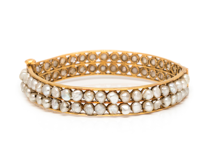 containing two rows of pearls measuring approximately 4.00 mm in diameter, the bangle measuring approximately 10.00 mm wide, with hinged clasp.