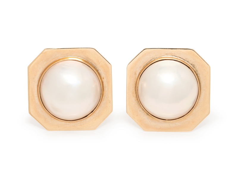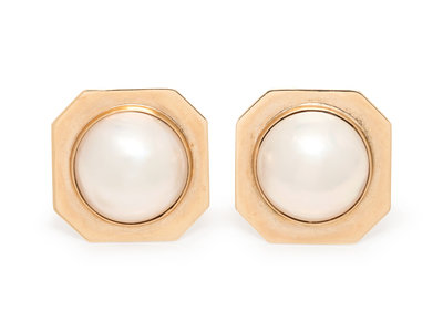 A Pair of 14 Karat Yellow Gold and Cultured Mabe Pearl Earclips,