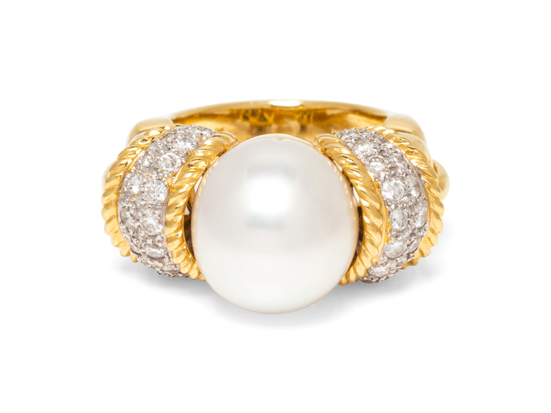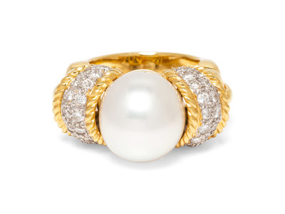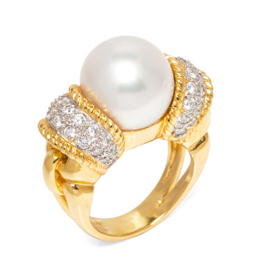 An 18 Karat Yellow Gold, Cultured Pearl and Diamond Ring,