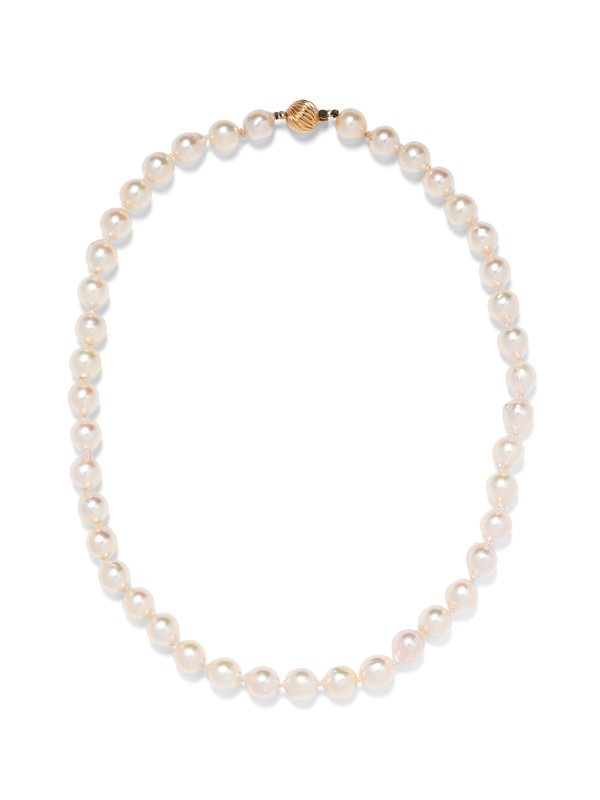 containing 42 pearls measuring approximately 9.10-9.75 mm strung knotted with a ribbed box clasp.