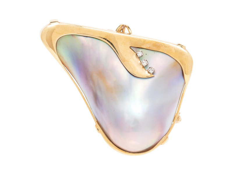 containing one freeform mother-of-pearl plaque and three round brilliant cut diamonds weighing approximately 0.02 carat total.