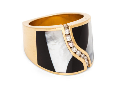 A 14 Karat Yellow Gold, Diamond, Onyx and Mother-of-Pearl Ring,