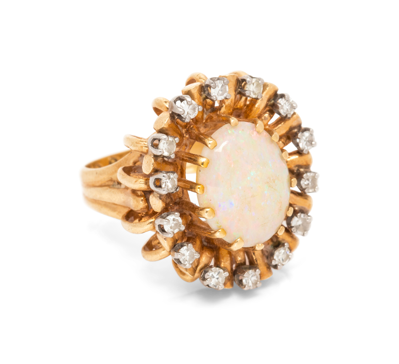 containing one oval cabochon cut opal measuring approximately 12.00 x 9.95 mm and 14 single cut diamonds weighing approximately 0.25 carat total.