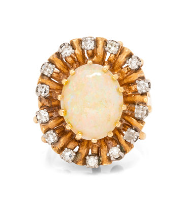 A 14 Karat Yellow Gold, Opal and Diamond Ring,