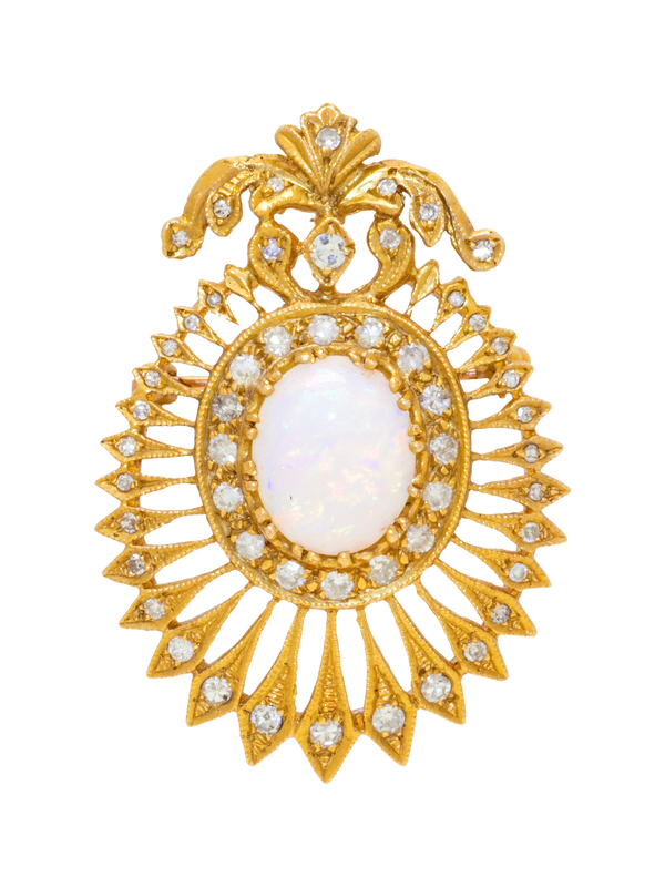 containing one oval shape cabochon cut opal and 53 single cut diamonds weighing approximately 0.50 carat total.
