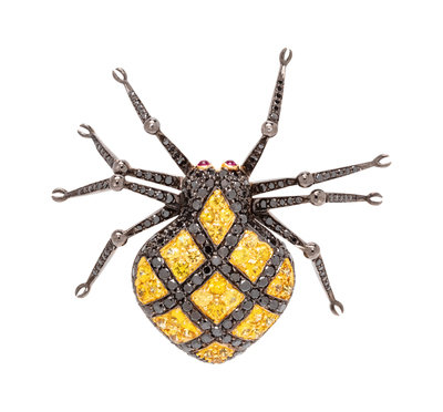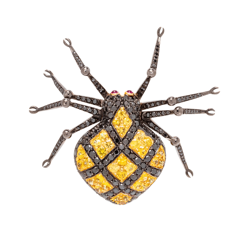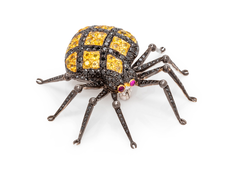 containing numerous round brilliant cut black diamonds (origin of color not tested) weighing approximately 1.50 carat total, 33 round brilliant cut yellow sapphires measuring approximately 1.75-2.30 mm and two round cabochon cut ruby eyes, with articulated legs design.
