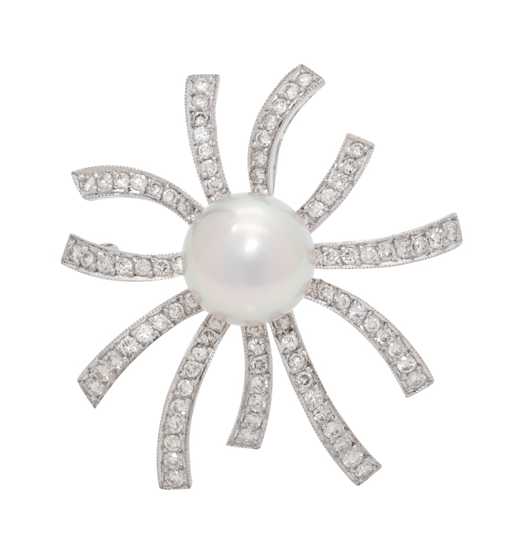 A White Gold, Cultured Pearl and Diamond Brooch,