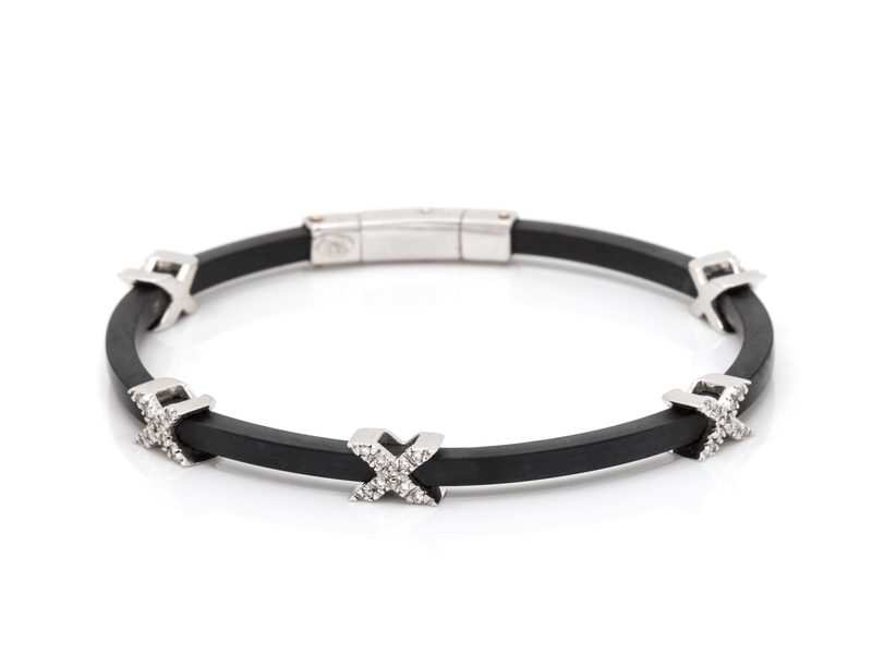 consisting of a rubber bracelet surmounted with five 'X' motifs containing 45 round brilliant cut diamonds weighing approximately 0.15 carat total.