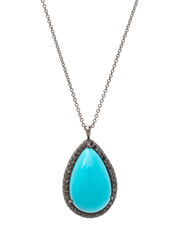 containing one pear shape cabochon cut turquoise measuring approximately 27.00 x 16.90 x 8.00 mm and numerous round mixed cut black diamonds (origin of color not tested) measuring approximately 1.30 mm in diameter, suspended from a cable link chain.