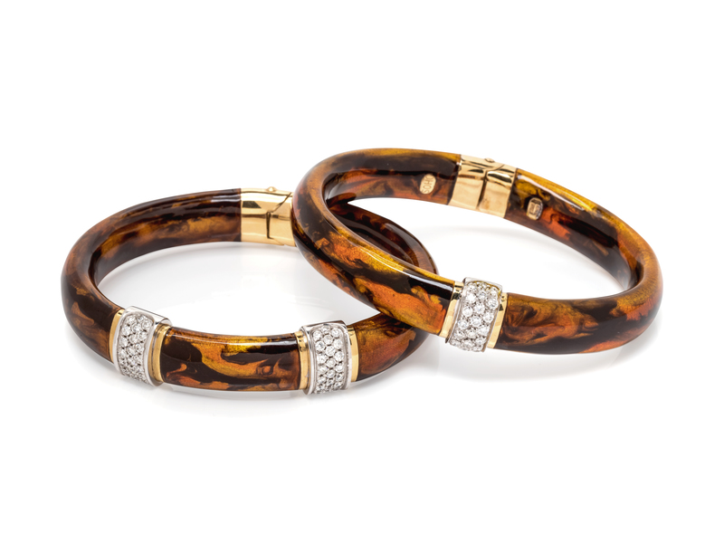comprised of one bangle containing 22 round brilliant cut diamonds weighing approximately 0.66 carat total and one bangle containing 44 round brilliant cut diamonds weighing approximately 0.88 carat total, both with brown marble enamel and flexible hinge closure.