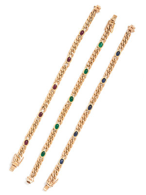 consisting of a bracelet containing four oval shape cabochon cut rubies measuring approximately 5.00 x 3.50 mm, a bracelet containing four oval shape cabochon cut sapphires measuring approximately 5.00 x 3.50 mm, together with a bracelet containing four oval shape cabochon cut rubies measuring approximately 5.00 x 3.50 mm.