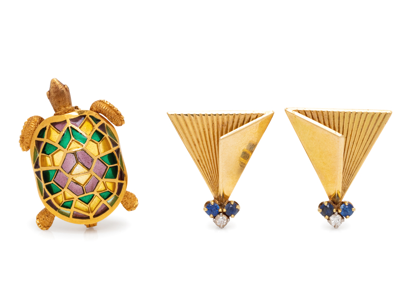 consisting of an 18 karat turtle brooch with translucent polychrome enamel, together with a pair of 14 karat earclips containing two round brilliant cut diamonds weighing approximately 0.08 carat total and four round mixed cut sapphires.