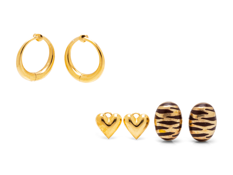consisting of a pair of 14 karat gold hoop earclips, a pair of heart earclips, together with a pair of Italian sterling silver, gold and enamel zebra motif earclips.