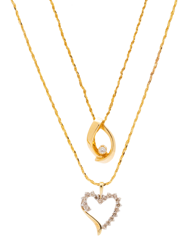 consisting of a 14 karat gold pendant by Cardow containing one round brilliant cut diamond weighing approximately 0.10 carat, suspended from an Italian fancy link chain, together with a 10 karat gold heart pendant containing 17 round brilliant cut diamonds weighing approximately 0.50 carat total, suspended from an Italian fancy link chain.