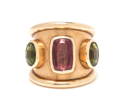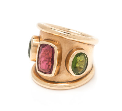 A 14 Karat Yellow Gold, Pink Tourmaline and Peridot Ring, M+J Savitt,