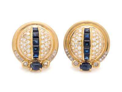 A Pair of 18 Karat Yellow Gold, Sapphire and Diamond Earclips,