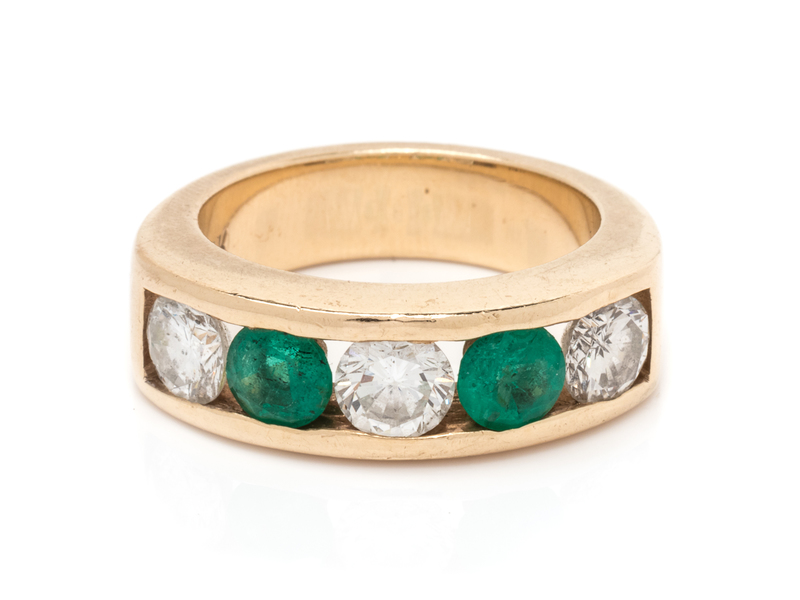 containing three round brilliant cut diamonds weighing approximately 1.50 carats total and two emeralds measuring approximately 4.90 mm in diameter.