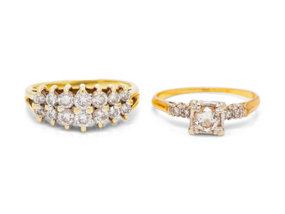 consisting of a ring containing 14 round brilliant cut diamonds weighing approximately 0.55 carat total, together with a bicolor gold ring containing one round brilliant cut diamond weighing approximately 0.30 carat and four single cut diamonds.