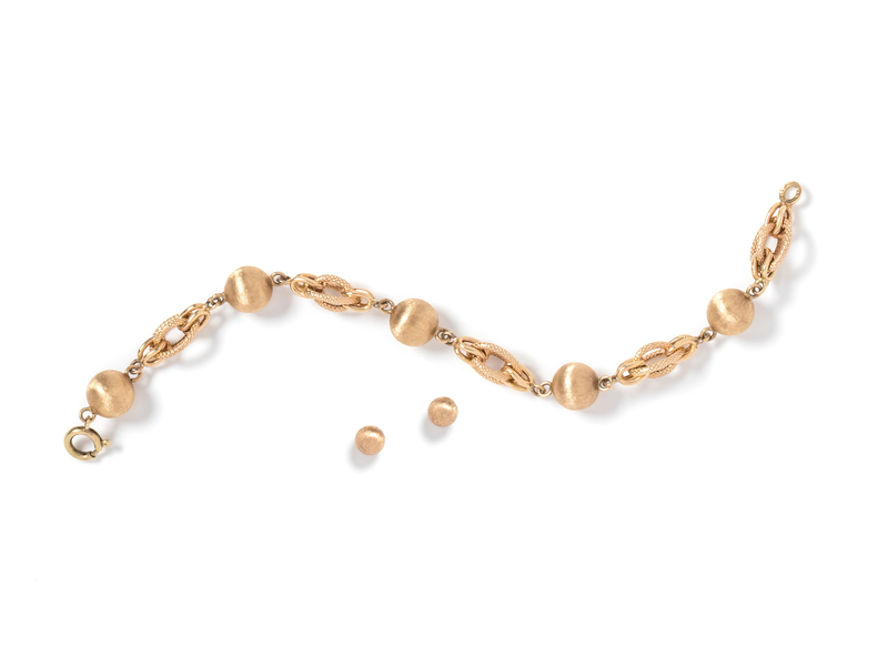 consisting of a bracelet with brushed gold spheres and textured gold links, together with a pair of brushed gold sphere stud earrings.