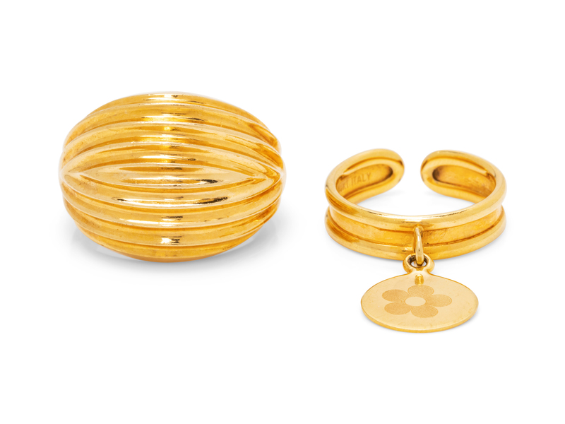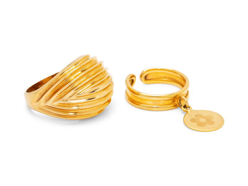 consisting of a ribbed bombe ring, together with a ring with a hanging disc pendant with flower motif.