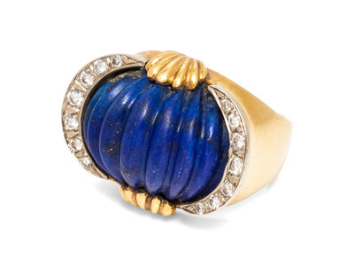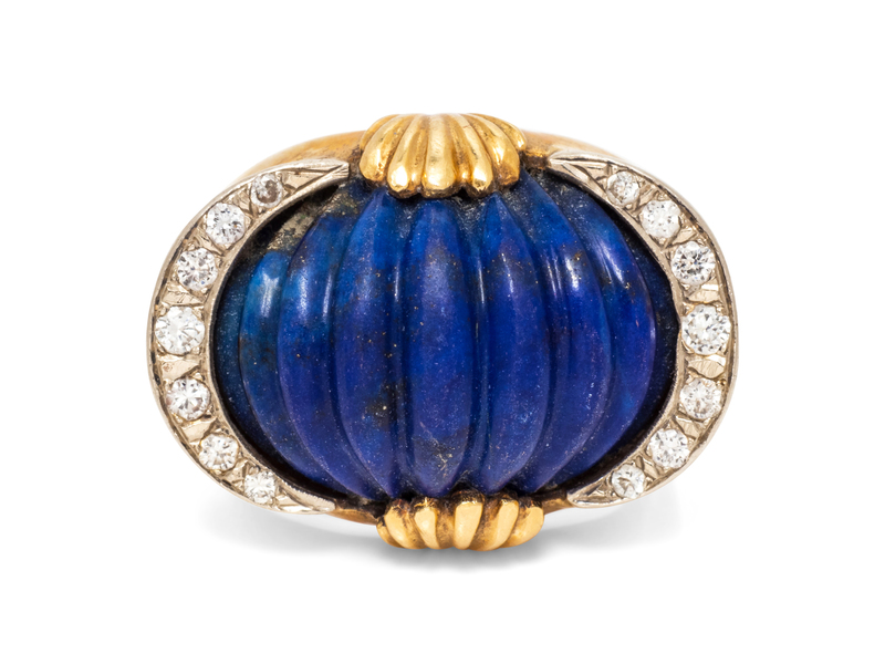 containing one melon carved lapis lazuli and 14 round brilliant cut diamonds weighing approximately 0.20 carat total.
