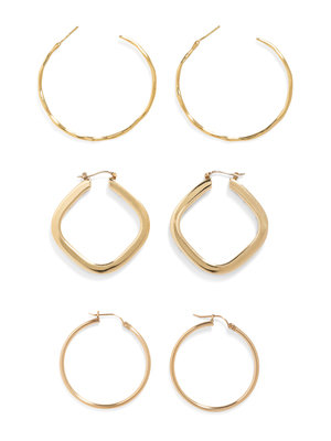 consisting of a pair of 18 karat yellow gold 'Glamazon Squiggle' hoop earrings measuring approximately 45.00 mm in diameter by Ippolita, a pair of 14 karat gold square hoops measuring approximately 37.00 mm in diameter, together with a pair of 14 karat gold hoop earrings measuring approximately 34.00 mm in diameter.