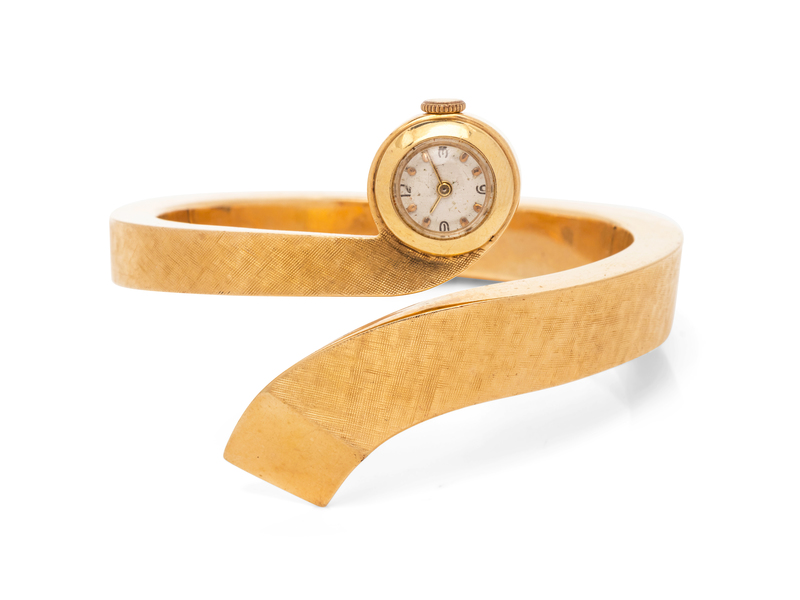 in a bypass hinged cuff design, the watch with 15.00 mm case diameter, matte silvered dial, black Arabic and applied gold dot numerals, gold pencil hands, snap on case back, 17 jewel movement signed PERY WATCH, hinged bangle with Florentine finish.