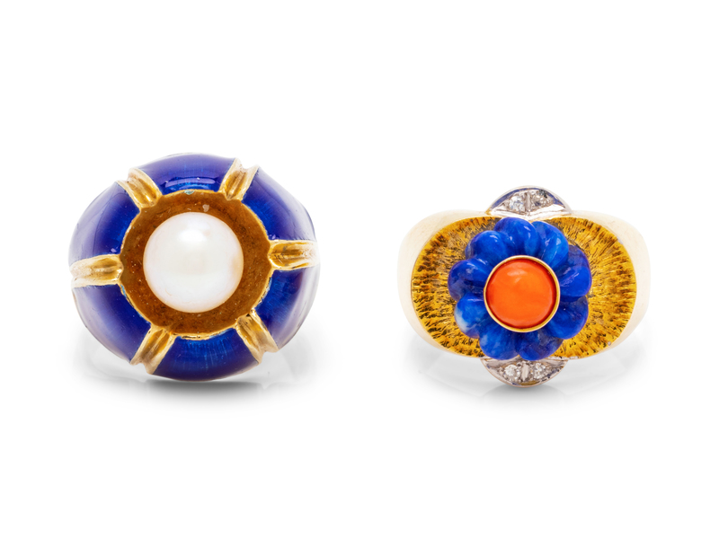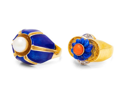 consisting of a ring containing one cultured pearl measuring approximately 7.70 mm in diameter with blue enamel surround, together with a ring containing one round cabochon cut coral with carved lapis lazuli surround and four single cut diamonds.