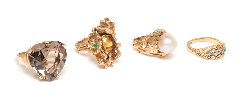 consisting of a 14 karat gold ring containing one cultured pearl measuring approximately 10.20 mm in diameter, a ring containing one heart shape smokey quartz measuring approximately 20.30 x 20.25 mm, a 14 karat gold ring containing ten round single cut diamonds and a 14 karat gold ring containing one oval shape step cut citrine measuring approximately 10.35 x 7.75 mm and one round brilliant cut emerald measuring approximately 2.75 mm in diameter.