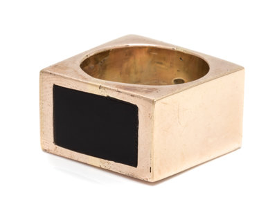 consisting of a square profile ring inlaid with a rectangular onyx plaque on one side.