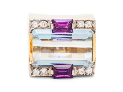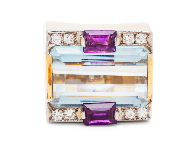 containing one octagonal step cut aquamarine measuring approximately 17.65 x 10.65 mm, two rectangular step cut amethyst and eight round brilliant cut diamonds weighing approximately 0.15 carat total.